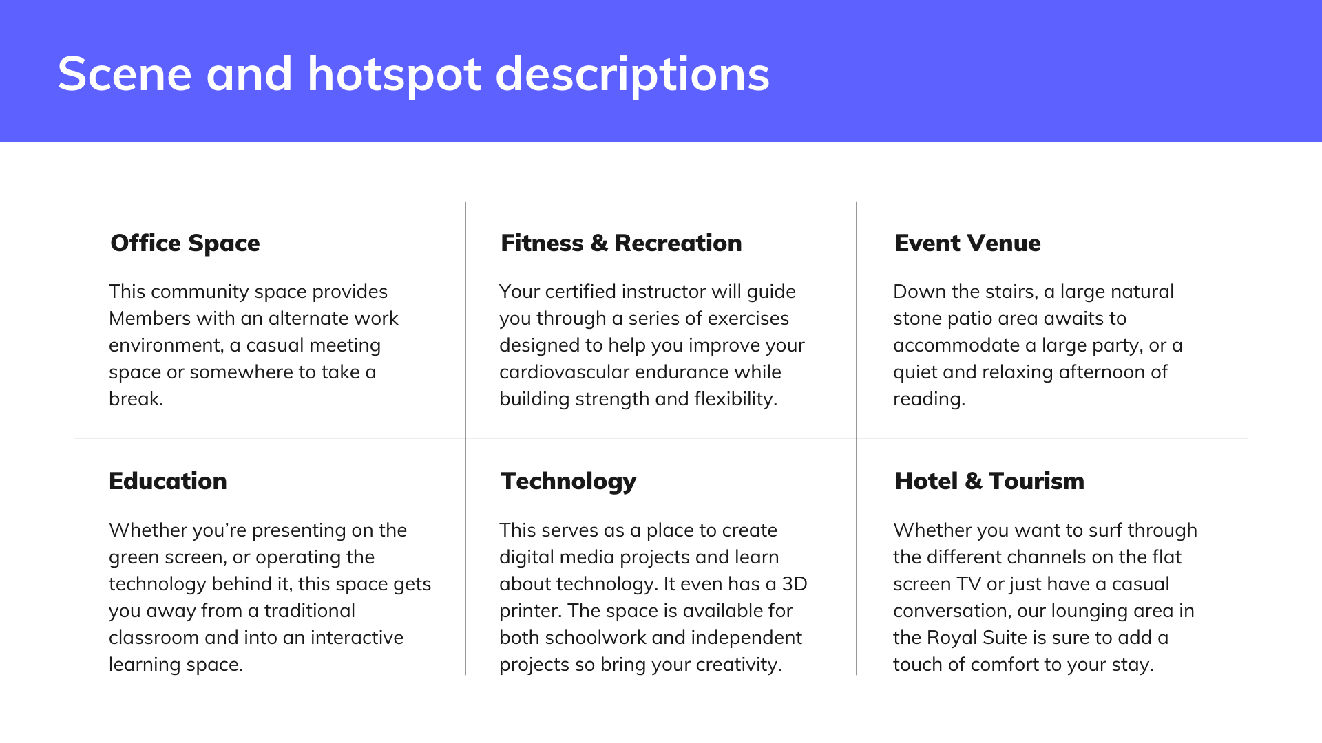To illustrate these concepts in action, below are a sample of scene and hotspot descriptions from different verticals. They use customer-centric positioning (evidenced by the you's) and speak directly to the audience directly in a conversational way. Finally, they use vivid detail to describe spaces and benefits to end users.