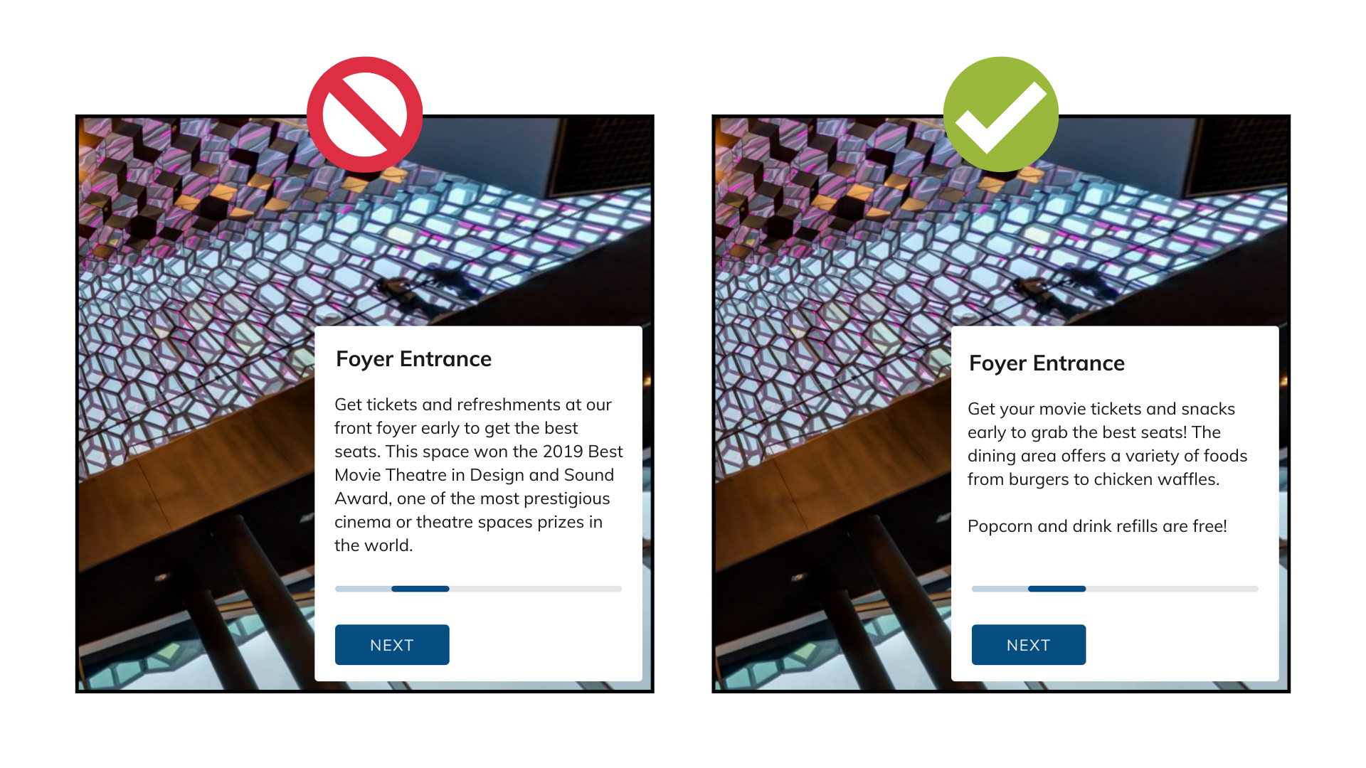 Audio narration makes the experience more sensory and immersive, while also enhancing accessibility, and is a sure way to increase user engagement metrics. If you're planning to add audio narration in future, here are a few tips for writing narrative text descriptions: