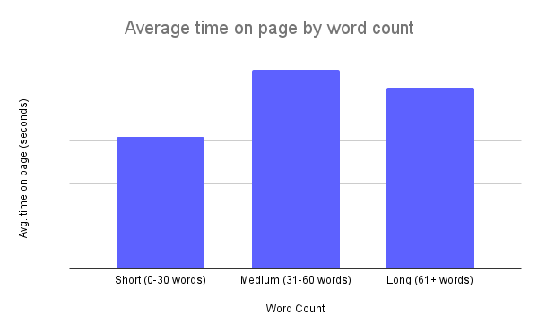 Analyzing average time on page metrics across 3 word count buckets revealed a sweet spot from the 'medium' scene grouping with 31 to 60 words in descriptions. There appears to be a positive correlation between the amount of text and the average time the user spends on a page up to the medium bucket, but a slight drop-off in average time per page in longer descriptions. Based on this, a general guideline is to use at least 45 words in text descriptions. With an average adult reading speed of 200 to 300 words per minute (Medium uses 265 WPM), you would expect to visitors to spend an average of 9 to 13.5 seconds on the page to read text, plus time to view imagery.